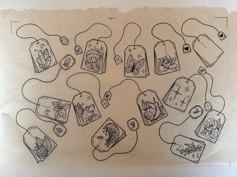 עיצוב זה כולל שקיות תה נפלאות וקסומות שצוירו על ידי פופי אוליביה דירדס המוכשרת @poppyoliviatattoo.
