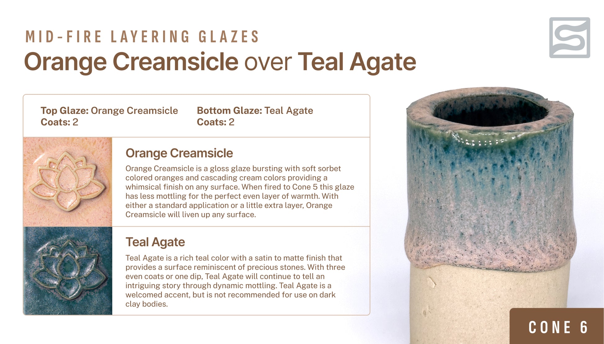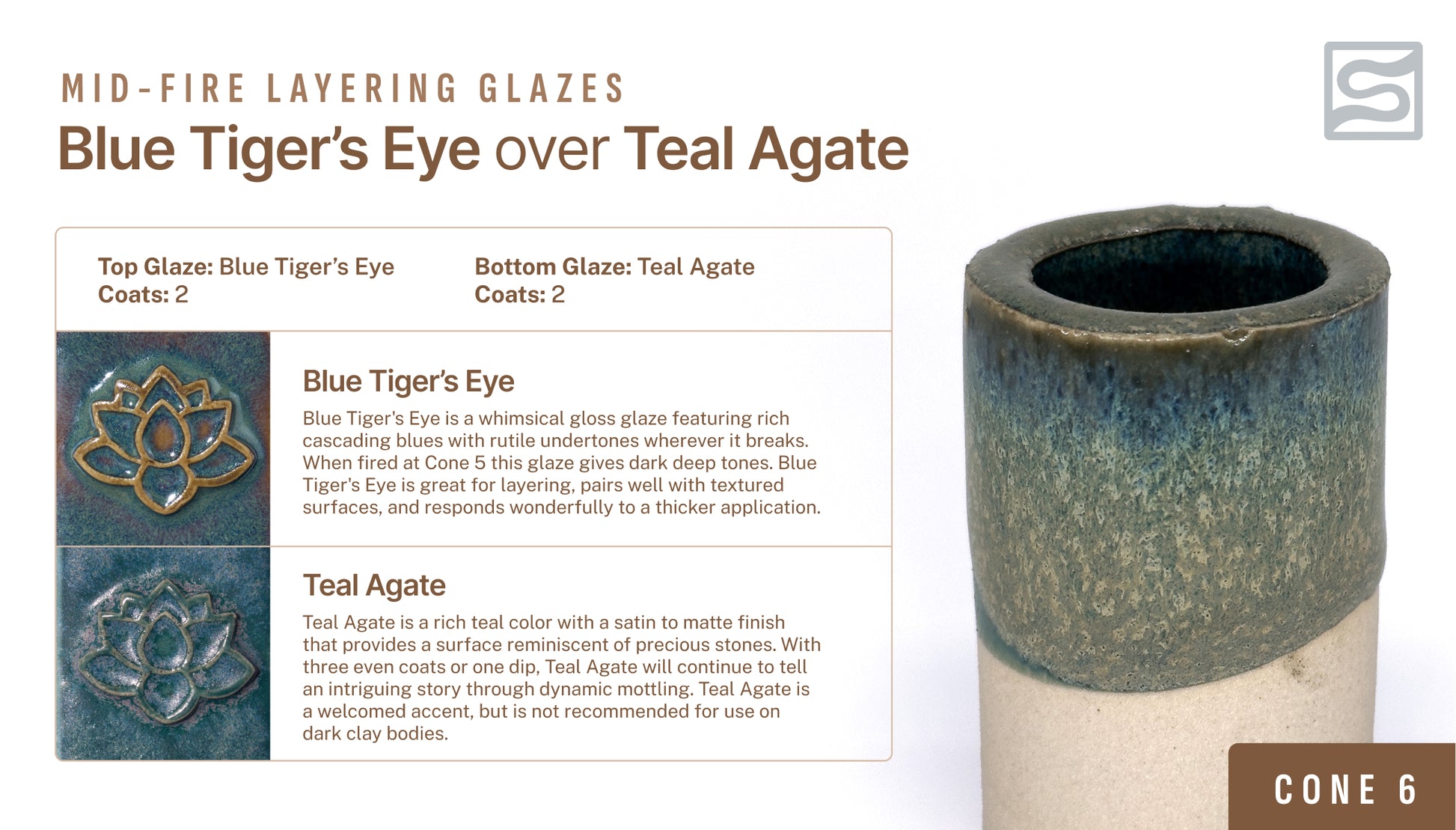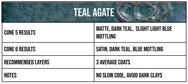 אגת טורקיז היא צבע טורקיז עשיר עם גימור סאטן עד מט המספק משטח המזכיר אבנים יקרות. עם שלוש שכבות אחידות או טבילה אחת, אגת טורקיז תמשיך לספר סיפור מסקרן באמצעות כתמים דינמיים. אגת טורקיז היא גימור מבורך, אך אינו מומלץ לשימוש על גופי חרס כהים.